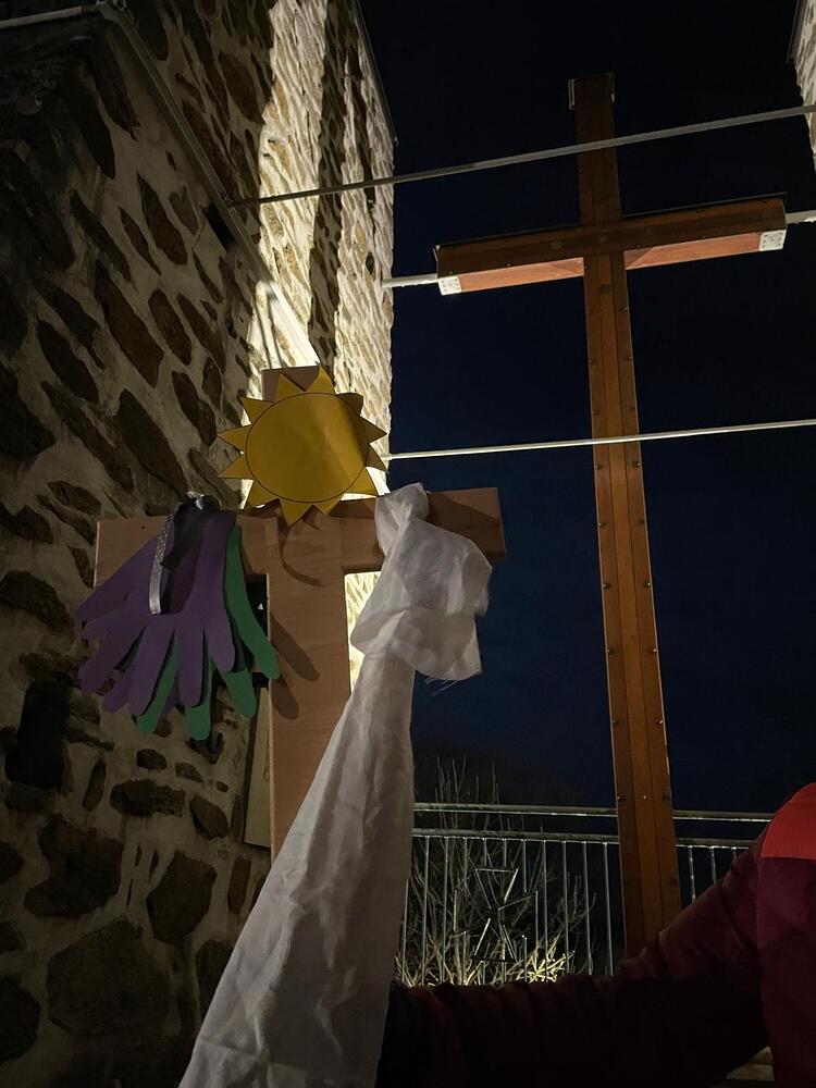 Mit Fackeln zogen sie, begleitet von einem Trommler und einer Bläsergruppe, auf den Erlebnisberg. Unterwegs gestaltete jede Pfarre eine Kreuzwegstation. Beim Kriegerdenkmal spendete Pfarrer Christoph Grabner den Schlusssegen.