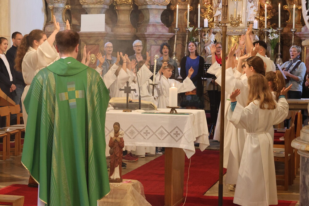 Am 21. September wurden bei der Mini-Messe wieder vier neue Ministrantinnen und Ministranten in die Gemeinschaft aufgenommen und erhielten Cingulum und Kreuz als Zeichen ihres "Amtes". Vikar Elias Kraxner überreichte die Ministrantenausweise.
