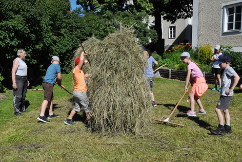 Ein kleiner Teil der Grünfläche wird als Blumenwiese stehen gelassen und dann als Heu geerntet. So wird den Kindern die Arbeit der Heuernte nach alter Methode gezeigt.