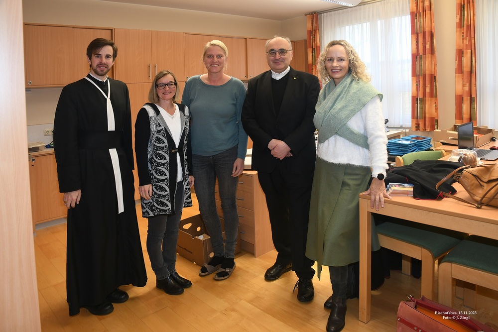 Begleitet von Propst Bernhard Mayrhofer und Fachinspektorin Dietlind Artner-Kager, holte Bischof Wilhelm Krautwaschl die Volksschulkinder zum Gottesdienst ab. Nach der Hl. Messe besuchte er den Kindergarten.